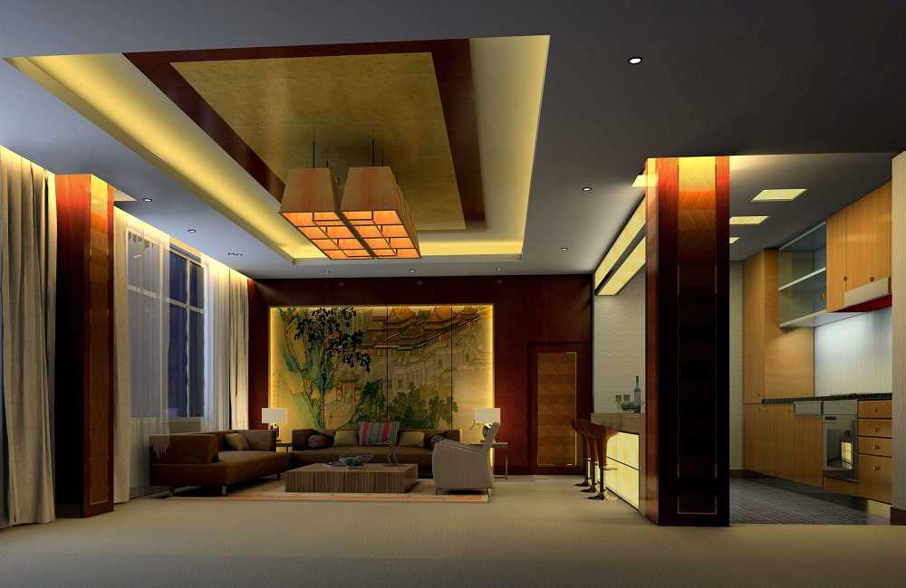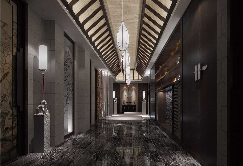 在中式酒店客厅的客厅设计上采用现代的装饰手法和家具,结合古典中式的装饰元素,来呈现亦古亦今的空间氛围。