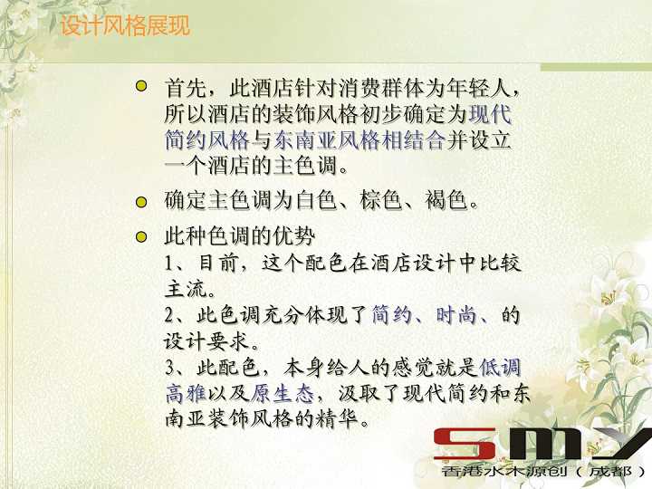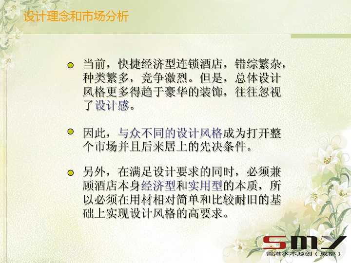掌握好酒店的设计理念和对市场的分析,定位好酒店的设计风格,针对不同的消费群体制定出不同的方法来满足不同消费群体的不同偏好。
