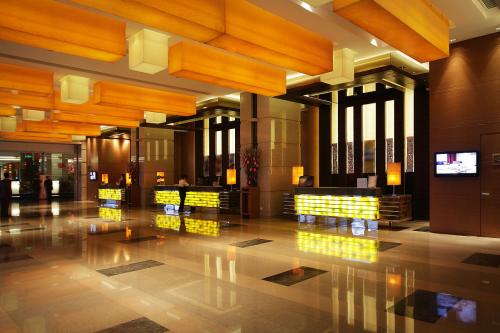 总服务台部分,现在总服务台已淘汰传统的设计,而是以岛式结构来替代。这样的设计在长度上可达到十余米,并把很多商务服务集中于此,给客人全面的服务。