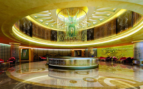 应按星级标准设计,其面积可按每间客房不少于0.6、0.8、1.0、1.2、1.4m2、计。大多数酒店的大堂面积一般按每间客房按0.6~1.0平方米计算,而大型豪华酒店和会议酒店可按1.0~1.4平方米设计。如一个五星级500间客房的酒店,大堂面积为500×1.2=600m2,又如一个三星级200间客房的酒店,大堂面积为200×0.8=160㎡。