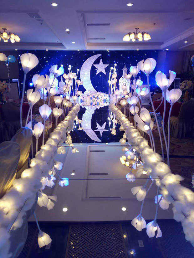 灯光的选用灯光起着关键的作用,婚礼的各个环节对于灯光的明暗要求有所不同,所以灯光的选择最好是可以调节明暗的。