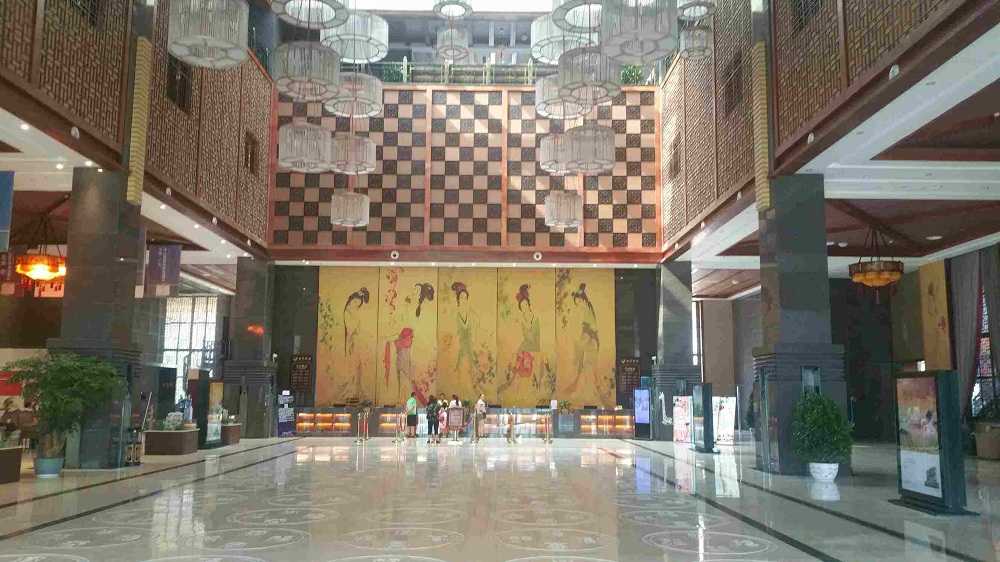 酒店的内部采用女皇富饶时期的风格,进门一龙一凤的金属雕塑,寓意当年二圣临朝。主楼一层为接待大堂,地砖采用定制的铜钱纹样,墙面镌刻女皇执政时期创造的文字,顶面奢华的灯具排列为“曌”字,象征日月凌空,普照大地。洗浴等待和休闲饮茶等区域的细节设计也极具宫廷气质和中式韵味,青瓦木梁,长圆门洞,石体浮雕和木质镂空隔断,搭配造型别致的宫灯和丝绸帘幕,让人仿佛身置古代。将牡丹、佛像、锦鲤等意向融入设计,墙面饰有仕女图、山河景等壁画,让人恍然梦回唐朝。古香古色的空间与一些现代材质协调一致,营造出酒店综合体华丽大气的舒适氛围。
